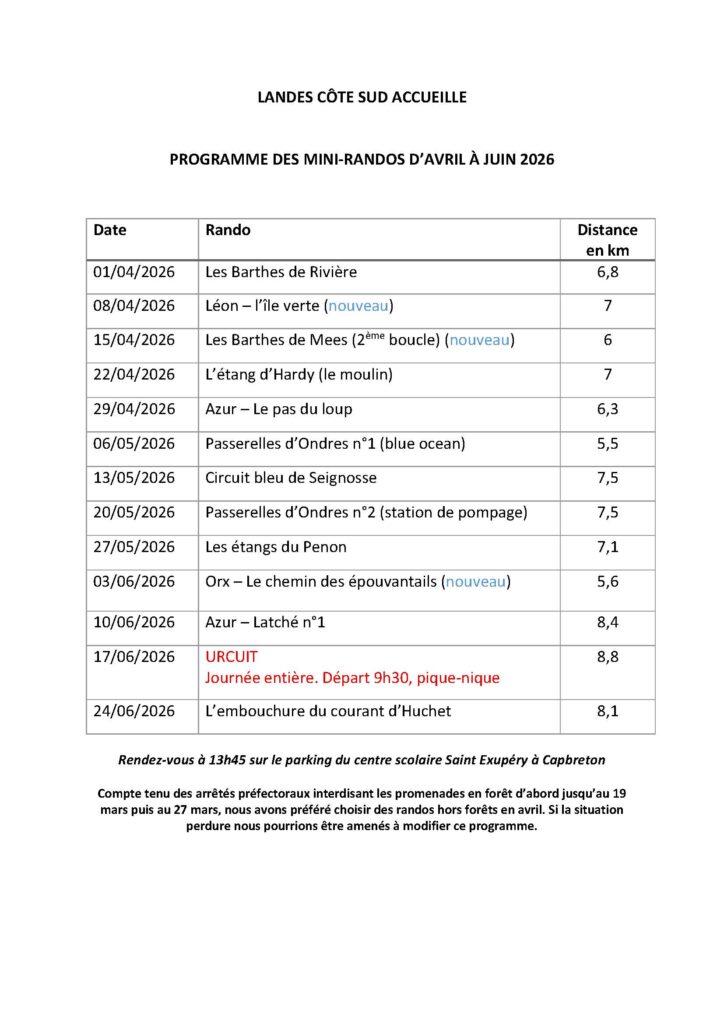 6 km à pied ……….. c´est une chanson, c´est aussi ce que nous faisons le mercredi, dans la joie et la bonne humeur !  Venez nous rejoindre, le rendez-vous à 13h45 sur le parking du centre scolaire Saint-Exupéry à Capbreton